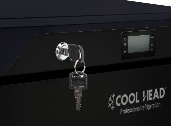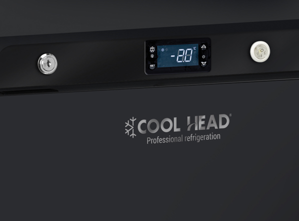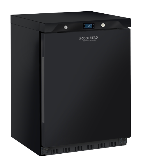 200 liters ABS freezer cabinet in black color and internally white thermoformed, fitted with a digital thermostat, reversible door, lock and main switch, handle along door profile, 2 fixed evaporator shelves + removable shelf in the middle, assembled 2 adjustable feet + 2 rollers at the back.