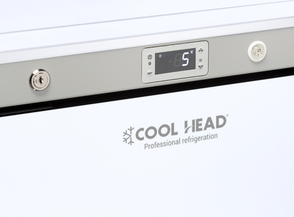200 liters solid door ABS cabinet comes in white finish and internally thermoformed, fitted with a digital thermostat, reversible door, lock and main switch, handle long door profile, 2 adjustable shelves + 1 shelf on the bottom side and 2 adjustable feet + 2 rollers at the back
