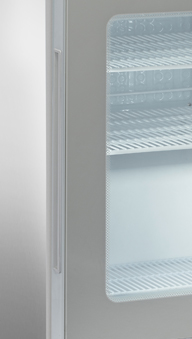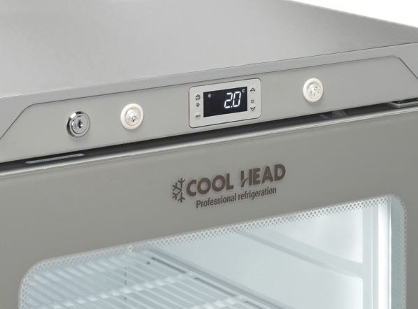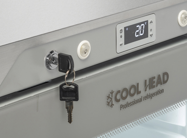 200 liters glass door ABS cabinet comes in stainless-steel finish and internally thermoformed, double temperated glass layer with Low-e, gray silk-printing frame for glass door, fitted with a digital thermostat and n.2 vertical lights along inner door profile, lock, main and separate light switch, integratred handle long door profile, 2 adjustable shelves + 1 shelf on the bottom side, assembled with 2 adjustable feet + 2 rollers at the back.