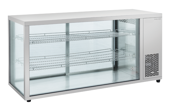 A countertop showcase with flat glass and steel frame and base, fitted with LED lights anti-condensation double layer glass, rear sliding doors and adjustable chromed shelves.