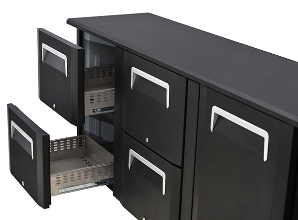 The QB 400 model has been designed to be an elegant, reliable and versatile back bar, perfect to maintain at the right temperature any kind of bottles and cans. With a capacity of 618L, finished in black powder coated galvanized steel with mat finishing for the exterior and in white coated steel for the inner side, this product is fitted with 4 hinged solid doors with foamed door handle, 8 adjustable chromed shelves, self-closing and reversible door, lock, digital thermostat and drawer cassette system as optional.