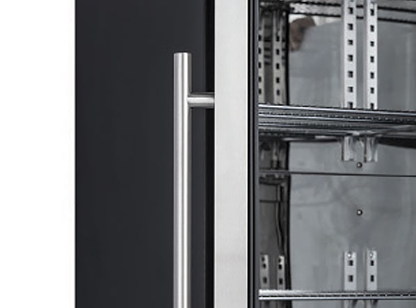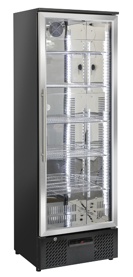 The DC 368 model has been designed to be a modern, reliable and versatile drink cooler. It is ideal to display and maintain any kind of bottles and cans at the right temperature. It is also customizable with promotional messages. With a capacity of 293L, it is finished in black coated steel on the exterior and with mirror stainless-steel on the interior. This product is fitted with a stainless-steel door frame with cylindrical handle, digital thermostat, 5 adjustable chromed shelf, inner vertical LED light with independent switch, self-closing door and lock.