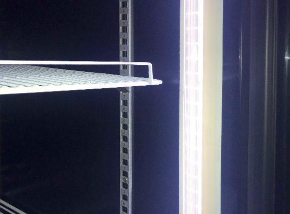The RC 300B model has been designed to be a reliable and versatile drink cooler with slim shape. It is ideal to display and maintain any kind of bottles and cans at the right temperature. It is also customizable with promotional messages. With a capacity of 300L, in black and with a painted aluminum door frame with integrated handle, this product is fitted with an inner vertical LED light with independent switch, 4 adjustable shelves in white color and a double-layer safety tempered glass.