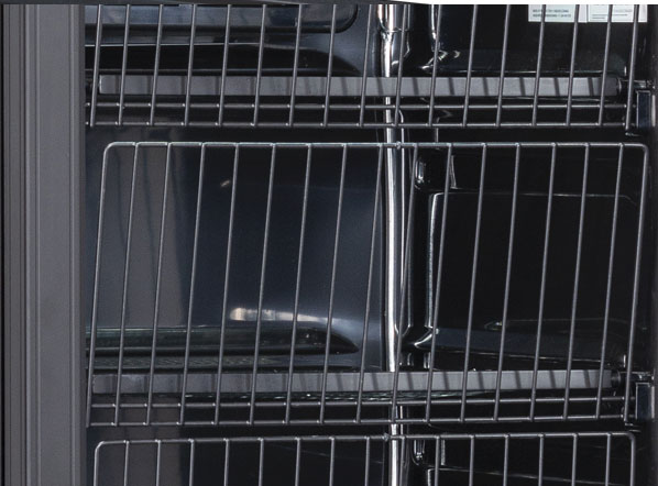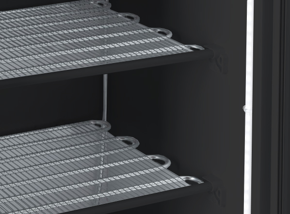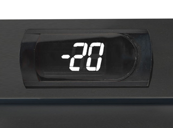 A 300L upright freezer in black color with an external aluminum handle. Fitted with a heated glass door with double safety tempered glass, static cooling system with fixed evaporator shelves, lock, self-closing door, inner vertical LED light with independent switch, mechanical thermostat and digital thermometer display. The CNG 390B model has been designed to be used in multiple ways, always guaranteeing correct food storage for proper display and appreciation of the products inside.