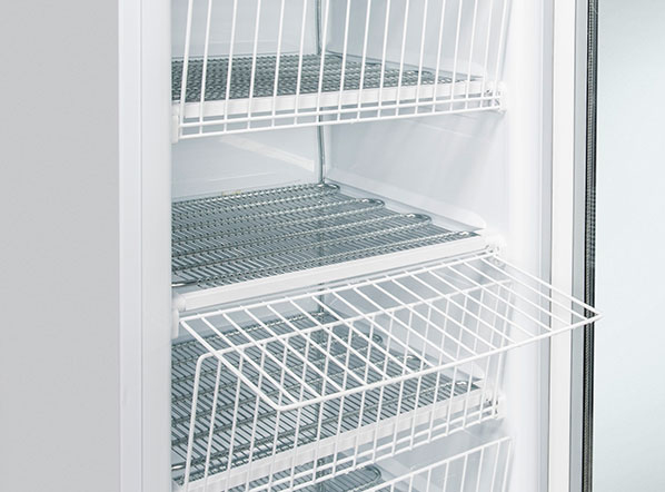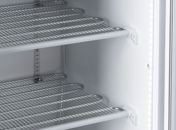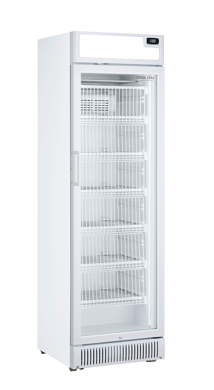 A 300L upright freezer in white color with with advertising panel an external aluminum handle. Fitted with a heated glass door with double safety tempered glass, static cooling system with fixed evaporator shelves, lock, self-closing door, inner vertical LED light with independent switch, mechanical thermostat and digital thermometer display. The CNG 390C model has been designed to be used in multiple ways, always guaranteeing correct food storage for proper display and appreciation of the products inside.