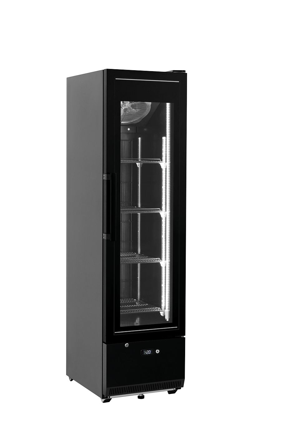 A clean-appearance upright freezer with one glass door and 200L capacity. It comes in black and with an inner vertical LED light with independent switch. It is fitted with a heated glass door with triple safety tempered glass, ventilated cooling system, 4 adjustable shelves, lock, self-closing door, 4 wheels for easy positioning and digital thermostat display. The RFG 200B model has been designed to be used in multiple ways, always guaranteeing correct food storage for proper display and appreciation of the products inside.