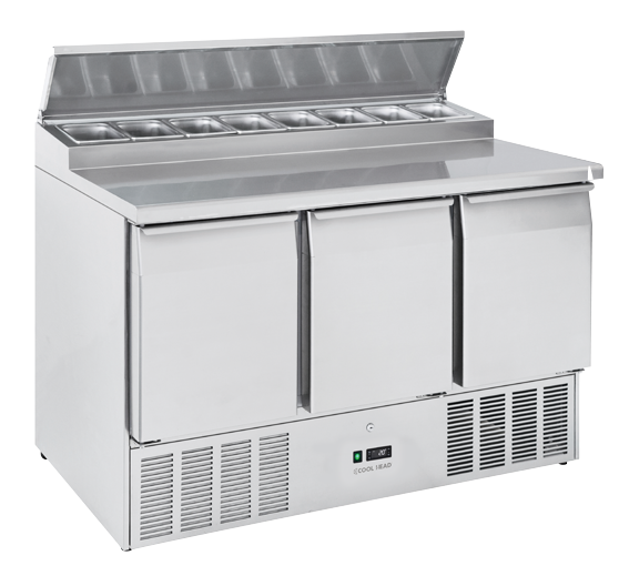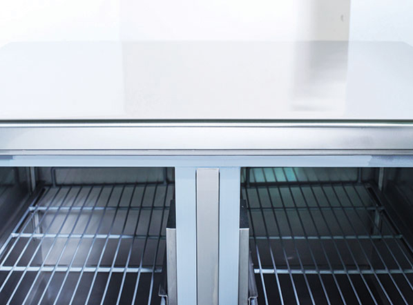 Clean and essential appearance, this pizza model with stainless steel top and an embedded space for 8 GN 1/6 pans (pans not included) is perfect to save space and offer a refrigerated workstation in any professional kitchen. The CRS 93A is a perfect example of efficiency, three doors, an adjustable shelf GN1/1 for each door, a digital thermostat, an engine room at the bottom, an easily removable condenser filter for smooth maintenance and cleaning and a sliding engine which is easy to pull out for manageable after-sales servicing.