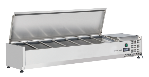 With a clean appearance comprised of all necessities, this model with stainless steel lid top fits perfectly with any professional prep station. With a width of 1500 mm, the VRX 15/335S/S is suitable for 7 GN1/4 pans (not included), offers a digital thermostat and adjustable feet as standard and high stainless-steel feet (180-210 mm) as optional.