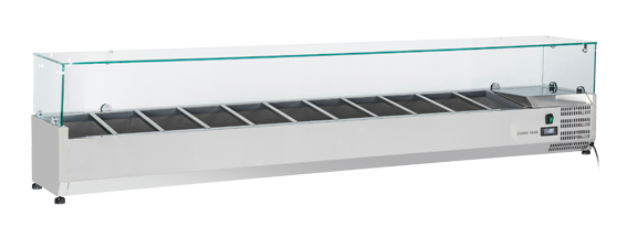With a clean appearance comprised of all necessities, this model with a flat glass top fits perfectly with any professional prep station. With a width of 2200 mm, the VRX 22/335 is suitable for 11 GN1/4 pans (not included), offers a digital thermostat and adjustable feet as standard and high stainless-steel feet (180-210 mm) as optional.
