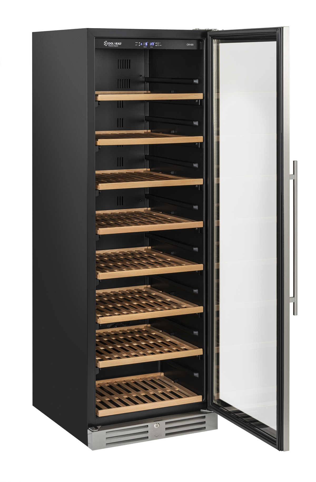 The CW 400 model is a modern mono temperature wine cellar suitable to contain up to 165 bottles and is designed and manufactured with the greatest care and attention in order to achieve advanced performances and high-quality standards. This professional wine cellar is equipped with 8 wooden bottle holder racks, a blue LED digital display, an interior blue LED light, a reversible door with a vertical cylindrical handle, a lock, a tinted glass door for wine protection and an opening door alarm.